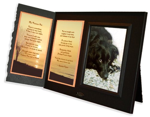 "My Forever Pet" Poem Pet Loss Sympathy Picture Frame Gift and Memorial Keepsake, Black with Foil Accent We ship direct to recipient with your condolence message..Measres 8" x 7" and holds a standard 3 1/2" x 5" photo..Email pet's photo to e-store@expresslyyours.com; we'll make it a perfect sympathy gift..Crafted from archival textured cover stock assembled on a molded resin easel back..Presented in matching keepsake box plus includes matching message card.. This pet memorial frame is a unique remembrance...a worthy tribute to a cherished companion. It's pet sympathy gift that reflects your concern and support for someone experiencing the loss of a beloved pet. The frame combines your poem choice with a favorite photo. Its unique design has a relief-embossed panel that opens to reveal the poem. A recessed well next to the poem holds the 3.5" X 5" photo. This frame set is crafted from archivial quality textured cover stock...embossed and embellished with foil accents. The components are assembled onto a contemporary durable resin easel back. And then get Best price. More Detail