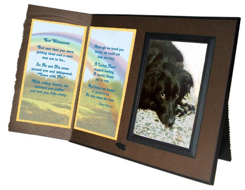 God Whispered Poem Pet Memorial Keepsake Picture Frame and Pet Loss Sympathy Gift, Rich Dark Brown with Foil Accent Email pet's photo to e-store@expresslyyours.com; we'll make it a perfect sympathy gift..Crafted from archival textured cover stock assembled on a molded resin easel back..Measres 8" x 7" and holds a standard 3 1/2" x 5" photo..Presented in matching keepsake box plus includes matching message card..We ship direct to recipient with your condolence message.. This pet memorial frame is a unique remembrance...a worthy tribute to a cherished companion. It''s pet sympathy gift that reflects your concern and support for someone experiencing the loss of a beloved pet. The frame combines your poem choice with a favorite photo. Its unique design has a relief-embossed panel that opens to reveal the poem. A recessed well next to the poem holds the 3.5" X 5" photo. This frame set is crafted from archivial quality textured cover stock...embossed and embellished with foil accents. The components are assembled onto a contemporary durable resin easel back. And right now get cheap price. Read More